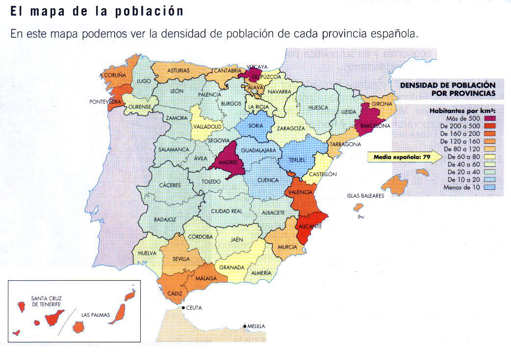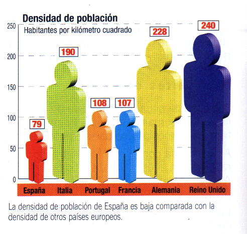 expresada en kilómetro cuadrado. La densidad de población de España es baja si se compara con la media europea, que es de 115 habitantes por kilómetro cuadrado. Dentro de España, la población no se encuentra repartida