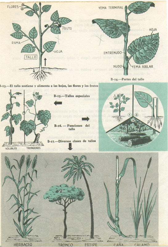 El tallo es la parte de la planta que crece en sentido contrario de la raíz. De él salen las ramas o tallos secundarios, las hojas, las flores y los frutos. Sostiene al resto de la planta. Conduce la savia por los vasos leñosos y liberianos. Forma y almacena la madera y sustancias de reserva |