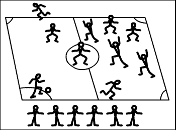 | Un equipo “pateará” el balón y el otro se encargará de recogerlo. Los jugadores que “patean” el balón elegirán un orden de actuación. En el otro equipo, un jugador colocado dentro del círculo central –que no puede salir de él- será el encargado de lanzar el balón hacia los pateadores y de recogerlo cuando sus compañeros se lo pasen. El jugador que da la patada al balón, nada más hacerlo tiene que ponerse a correr con la intención de “pisar” todas las bases antes de que el balón, recogido por los miembros del equipo contrario, llegue de nuevo al círculo central. Si ve que el balón va a llegar al círculo central antes de que él “pise” todas las bases podrá quedarse parado en una. |
