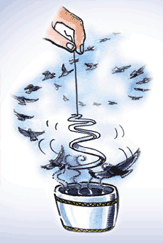 ¿Qué sucede? Las moléculas de aire, directamente encima de la taza, empiezan a moverse más rápidamente y a expandirse conforme absorben energía. Se incrementa el movimiento de las moléculas, así como la distancia entre ellas. El aire se torna más liviano y sube. Esta corriente le pega a la espiral y la hace girar. Esta energía también es usada por las aves que usan las termales de aire caliente para ascender, planeando en ellas. |