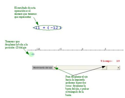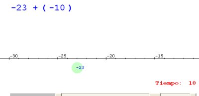 es decir, que a la posición anterior le tienes que restar 12, por lo tanto -11 - 12 = -23. Tenemos que representar el número -23 en el eje como se explica en la imagen. Cuando traslademos la bola a la posición -23 el programa nuevamente responderá: