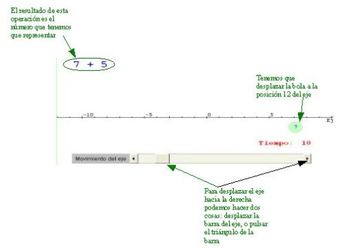 es decir, que a la posición anterior le añadimos ahora 5, por lo tanto 7 + 5 = 12. Tenemos que representar el número 12 en el eje como se explica en la imagen. Cuando traslademos la bola a la posición 12 el programa nuevamente responderá: