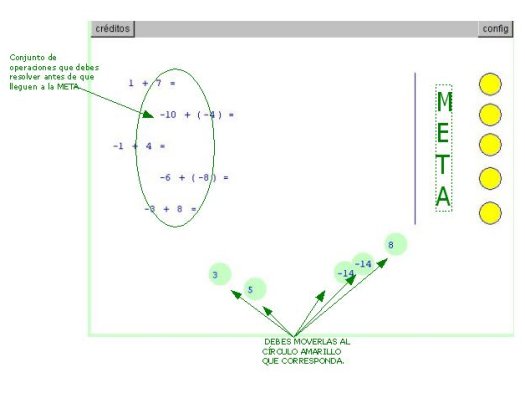 En la parte izquierda se encuentran cinco operaciones que se desplazan horizontalmente buscando la META. Debes desplazar las bolas verdes a los circulos amarillos que corresponda con la solución de cada una de las operaciones antes de que lleguen a la META. Las bolas verdes contienen la fracción solución (o número entero) ya simplificada.