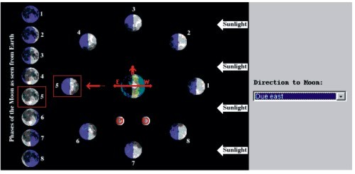En esta dirección http://www.calvin.edu/~lmolnar/moon/Tutorial3.html puedes encontrar un applet que simula las fases de la Luna y con el que puedes realizar algunos ejercicios para comprobar tu comprensión del modelo Sol-Tierra-Luna