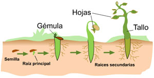Los cotiledones de la semilla pueden permanecer en el suelo o ser llevados al aire por el crecimiento de la nueva planta hacia arriba, generalmente permanecen en la planta durante varias semanas constituyendo el alimento de ésta en la etapa inicial, luego se marchitan y se desprenden de la planta.