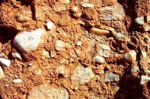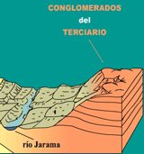 En la otra vertiente del valle hay una pared de rocas sedimentarias detríticas: conglomerados, arenas y arcillas, del terciario.