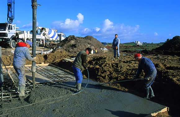 | El hormigón llega en un camión. Es conducido hasta el agujero a través de una larga manguera. Los tres hombres se aseguran de que el hormigón se dispone correctamente. Uno de ellos sostiene la manguera. El otro tiene un vibrador que compacta el hormigón. | El tercer hombre está ocupado alisando la superficie. El hormigón está hecho de gravilla, arena, cemento y agua. | ||