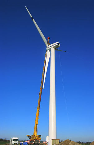 | 6) El rotor es colocado en la góndola. Esto puede resultar un tanto complicado si el rotor no se sitúa exactamente en frente de la góndola. |