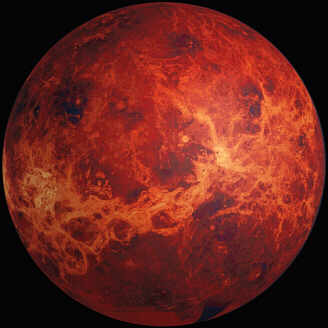 Venus es el segundo planeta del Sistema Solar en orden de distancia desde el Sol. Recibe su nombre en honor a Venus, la diosa romana del amor. Se trata de un planeta de tipo terrestre, llamado con frecuencia el planeta hermano de la Tierra, ya que ambos son similares en cuanto a tamaño y masa. Sin embargo, es diferente de la Tierra. No tiene océanos y su densa atmósfera provoca un efecto invernadero que eleva la temperatura hasta los 480 ºC. Venus gira sobre su eje muy lentamente y en sentido contrario al de los otros planetas. El Sol sale por el oeste y se pone por el este, al revés de lo que ocurre en La Tierra. Venus tiene muchos volcanes. El 85% del planeta está cubierto por roca volcánica. La lava ha creado surcos, algunos muy largos. Hay uno de 7.000 km. En Venus también hay cráteres de los impactos de los meteoritos. |