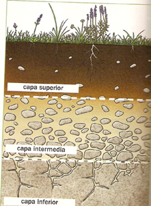 cubre las rocas y en la que crecen las raíces de las plantas.