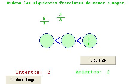 la que tiene mayor o menor denominador? En el centro de la pantalla aparecen tres circulos verdes, en ellos debes alojar las tres fracciones que aparecen arriba del programa en el orden de menor a mayor. Para trasladar las fracciones a los círculos verdes, pulsa con el botón izquierdo sobre una de ellas y llévatela dentro del círculo que creas.
