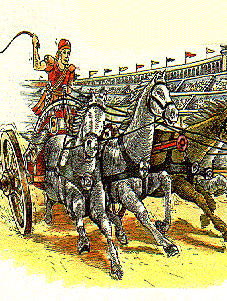 Carro de dos ruedas tirado por caballos. Los romanos utilizaron estos carros para luchar contras los pueblos germánicos. También eran muy aficionados a las carreras de carros en el circo.